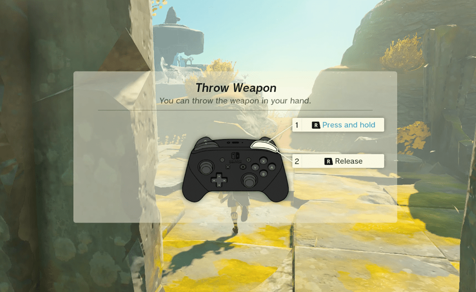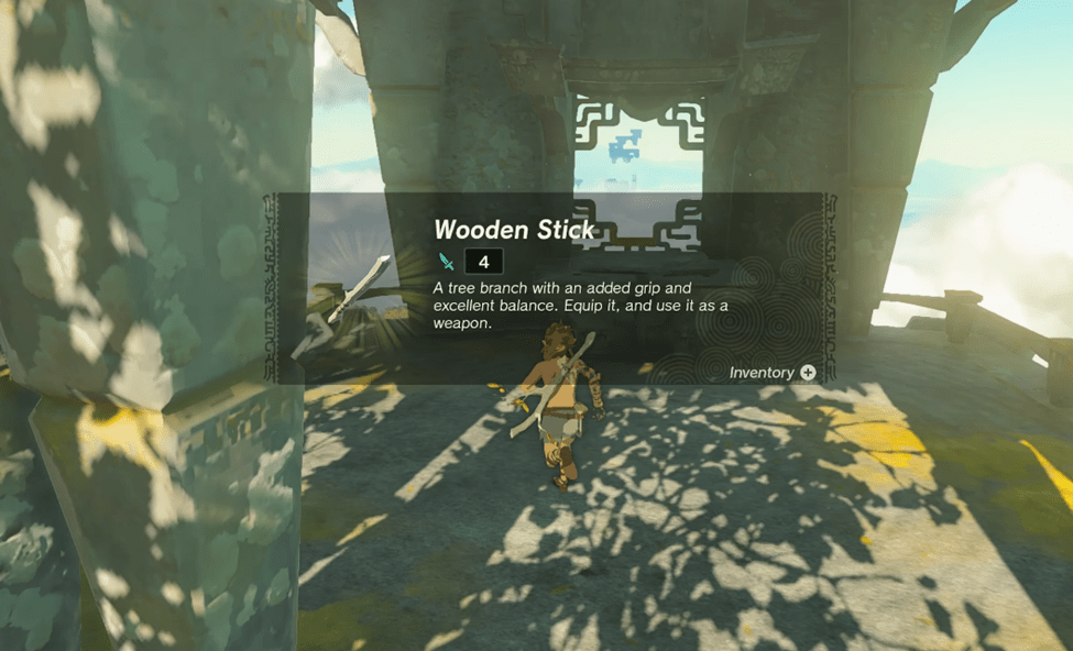 There’s nothing more in this direction, so turn around and follow the pathway to some ruins, where you’ll pick up another stick. A prompt will appear to teach you how to throw a weapon in Tears of the Kingdom.