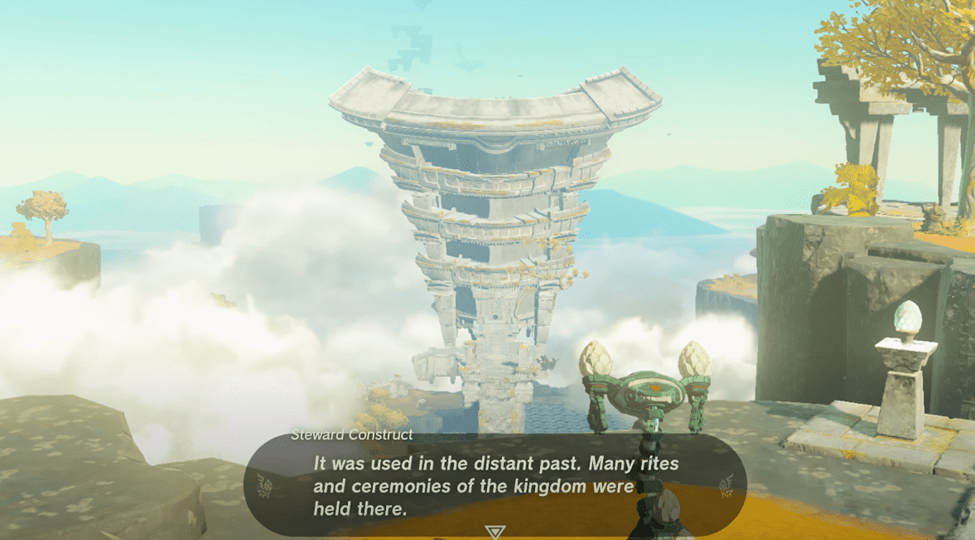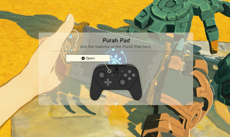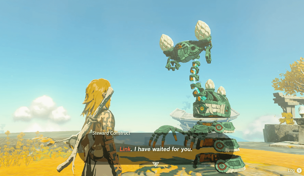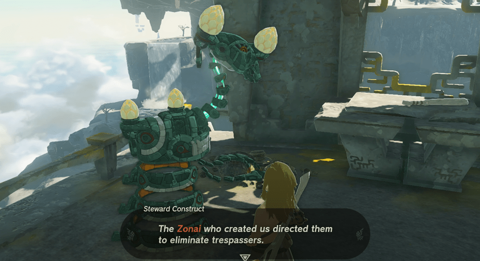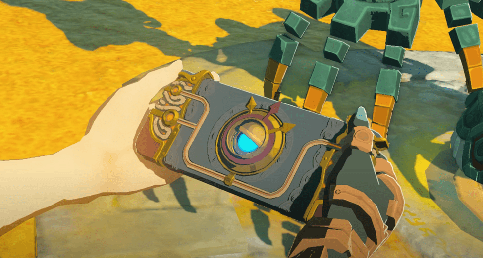 Fortunately, it seems to be friendly, telling you that Princess Zelda herself left something for you in its care. The Steward Construct will open up and give you a Purah Pod that looks mysteriously like a Nintendo Switch with a blue eyeball.