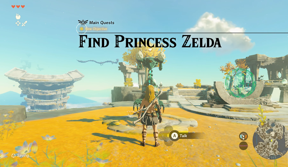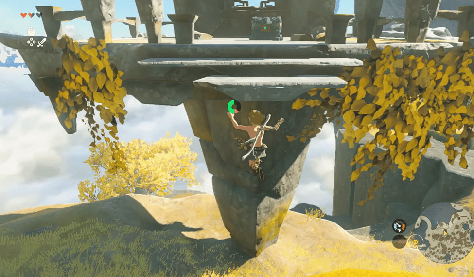 After practicing how to lock on to your enemies, explore the rest of the tiny island for more apples, sticks, and another Zonai Charge. Once you’ve collected everything, make your way to the green ledge and jump off.