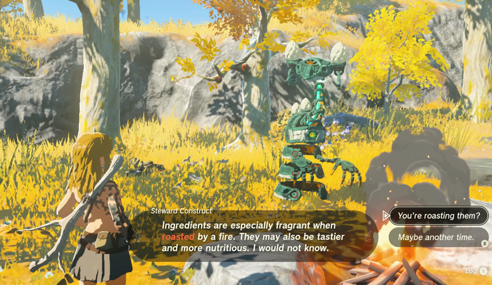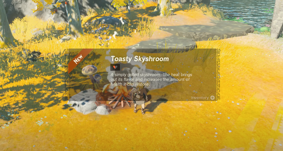 After listening to the Steward Construct’s instructions on roasting, despite the fact that it cannot taste itself, grab a handful of mushrooms nearby and haphazardly throw them into the fire to create a Toasty Skyshroom (You can also bake apples).