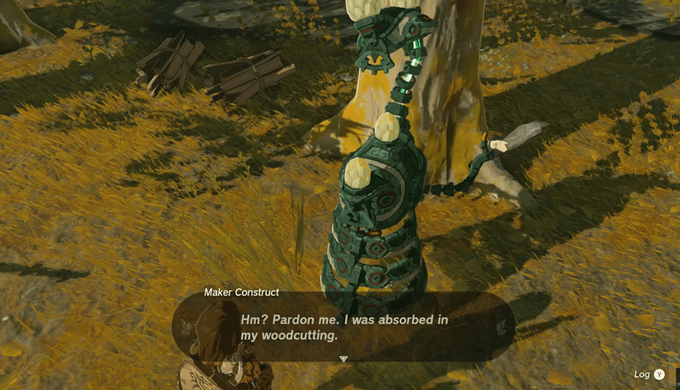 Near the campfire is a Maker Construct who is chopping down a tree. It tells you that logs can be combined to assemble platforms. You can also chop them down further to make wood. On a stump to the left of the Maker Construct is an axe you can pick up to begin your woodcutting journey.