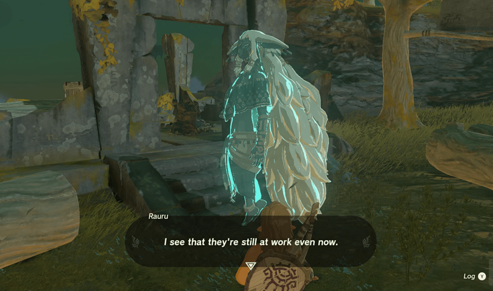 Walk a short distance from where you landed off of the platform to find Rauru again. He seems to be amazed that the constructs are still doing what they’ve been programmed to do. Go inside the dilapidated structure near Rauru to find a Zonai Charge and sticks.